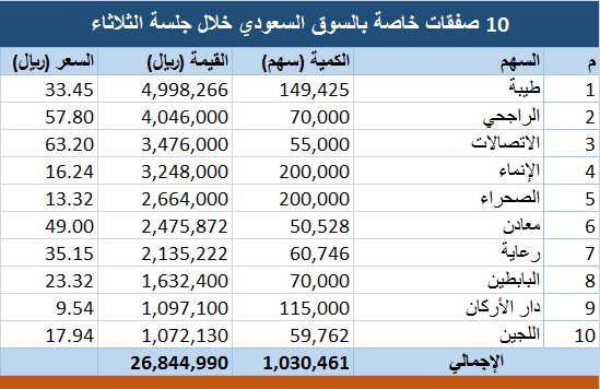 https://static.mubasher.info/File.St...a73079/640.jpg سبع دول عربية يتوقع صندوق النقد ارتفاع احتياطياتها الأجنبية 05 ديسمبر 2017 دبي- مباشر: أظهرت بيانات حديثة لصندوق النقد الدولي تكهنات بارتفاع الاحتياطيات النقدية الأجنبية لسبعة دول عربية، والإنفوجراف التالي يوضح تلك الاحتياطيات. http://data.directfn.com/mix2/Client...1-02-47 AM.jpg ====================================== محدث- 10 صفقات خاصة بالسوق السعودي قيمتها 27 مليون ريال https://static.mubasher.info/File.St...5baa61/640.jpg كانت أكبر الصفقات من حيث الكمية والقيمة على سهم "طيبة" 05 ديسمبر 2017 دار الأركان 4300 3.02% 10.92 0.32 الراجحي 1120 -0.51% 63.82 -0.33 اللجين 2170 2.21% 20.36 0.44 رعاية 4005 -0.28% 38.90 -0.11 الإتصالات 7010 -0.47% 69.80 -0.33 طيبة 4090 -1.75% 36.50 -0.65 الرياض - مباشر: شهد سوق الأسهم السعودية "تداول"، اليوم الثلاثاء، تنفيذ 3 صفقات خاصة على أسهم "طيبة، ورعاية، واللجين"، بقيمة إجمالية بلغت 26.84 مليون ريال، بتداول 1.03 مليون سهم. وكانت أكبر الصفقات من حيث الكمية والقيمة، على سهم "طيبة"، وبلغت قيمتها نحو 5 ملايين ريال، بكمية بلغت 149.4 ألف سهم، وتم تنفيذ الصفقة بسعر 33.45 ريال. أما أقل الصفقات من حيث القيم، فكانت لسهم "اللجين"، بقيمة تداول بلغت 1.07 مليون ريال، من خلال 59.76 ألف سهم، وتم التنفيذ عند سعر 17.94 ريال. http://data.directfn.com/mix2/Client...74000_0033.jpg والصفقات الخاصة هي الأوامر التي يتم تنفيذها عندما يتفق مستثمر بائع ومستثمر مشترٍ على تداول أوراق مالية محددة، بسعر محدد، بحيث تتوافق مع ضوابط السوق المالية السعودية (تداول)، والقواعد واللوائح الصادرة عن هيئة السوق المالية ذات العلاقة. ولا تؤثر الصفقات الخاصة على سعر آخر صفقة، وأعلى وأدنى سعر للسهم، وسعر الافتتاح، وسعر الإغلاق، ومؤشر السوق، أو مؤشرات القطاعات. بينما تؤثر الصفقات الخاصة على كمية الأسهم المتداولة، وقيمة الأسهم المتداولة، وعدد الصفقات المتداولة. ======================================== === أرامكو السعودية ترفع أسعار جميع أنواع الخام لآسيا في يناير https://static.mubasher.info/File.St...61b6f0/640.jpg رفعت الشركة سعر البيع الرسمي للخام العربي الخفيف للعملاء في آسيا في يناير 40 سنتاً للبرميل مقارنة بالشهر السابق 05 ديسمبر 2017 الرياض – مباشر: قال مصدر مطلع، اليوم الثلاثاء، إن شركة أرامكو السعودية رفعت سعر بيع جميع الخامات إلى العملاء الآسيويين في يناير 2018. وأضاف المصدر وفقاً لـ"رويترز"، أن السعودية رفعت سعر البيع الرسمي للخام العربي الخفيف للعملاء في آسيا في يناير 40 سنتاً للبرميل مقارنة بالشهر السابق، وذلك بعلاوة سعرية 1.65 دولار للبرميل فوق متوسط خامي دبي وسلطنة عمان المنشور من وكالة بلاتس. وتعتبر هذه العلاوة للخام السعودي الرئيسي الأعلى منذ سبتمبر أيلول 2014 وفقاً لبيانات رويترز. وكانت الشركة قد رفعت سعر البيع الرسمي لخامها العربي الخفيف لآسيا في ديسمبر، بمقدار 65 سنتاً للبرميل مقارنة بالشهر السابق، ليسجل علاوة قدرها 1.25 دولار للبرميل فوق متوسط سعر خامي عمان ودبي القياسيين. ================================ تقرير: 6.6% زيادة بالزائرين الخليجيين لبريطانيا..و485 مليون دولار إنفاق السعوديين https://static.mubasher.info/File.St...8d4cc3/640.jpg تراوح متوسط إنفاق المسافرين من دول مجلس التعاون الخليجي بين 1150 و3153 دولاراً في الرحلة الواحدة بالعام 2016 05 ديسمبر 2017 11:54 ص الرياض - مباشر: كشف تقرير لمعرض سوق السفر العربي (الملتقى) عن زيادة عدد زوار المملكة المتحدة القادمين من المملكة العربية السعودية، والإمارات العربية المتحدة، والكويت، والبحرين، إلى 659,466 شخصاً في العام 2016؛ أي بزيادة قدرها 6.6% تعادل نحو 5 آلاف زائر، بالمقارنة مع العام السابق. وذكر التقرير الذي أجرته كوليرز إنترناشونال، شريك الأبحاث الرسمي لمعرض سوق السفر العربي، اطلع "مباشر" على نسخة منه، أن المملكة المتحدة زارها أكثر من 350 ألف زائر من دولة الإمارات العربية المتحدة، وأكثر من 150 ألف زائر من المملكة العربية السعودية، وأكثر من 100 ألف زائر من الكويت، ونحو 50 ألف زائر من البحرين. وبهذا السياق، قال سيمون بريس، مدير أول معرض سوق السفر العربي: