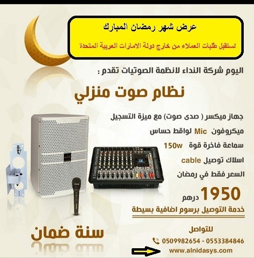 ( النداء لانظمة الصوتيات ،تعتبر شركة النداء لانظمة الصوت الرائدة بمجال بيع ،تركيب ،صيانة جميع اجهزة الصوت ومعدات ضبط الصوت . https://i.suar.me/rnEjq/l منذ انطلاق شركة النداء للصوتيات اخذنا وعدا على انفسنا بان تكون شركة النداء لانظمة الصوتيات الاولى بمعنى الكلمة من خلال الخدمات التي نقدمها وهي : بيع اجهزة الصوت بجميع انواعها مثال: مكبرات الصوت الاحترافي ذو الجودة العالية . سماعات سقفية داخلية وخارجية. سماعات الصوت المتنقلة البلوتوث . سماعات الصوت القابلة للشحن. سماعات الحدائق . سماعات المساجد الداخلية والخارجية. الميكروفونات بانوعها ، ميكرفون سيلكي وميكروفون لا سيلكي . ميكروفون قابل للشحن ،ميكروفون متحرك ،ميكروفون ثابت. مكبرات الصوت للمعلمين والندوات و المحاضرات. نظام الاذان الموحد للمساجد ،نظام الاذان الموحد للمنازل نظام صوتي كامل للمساجد بجميع انواعه ميكرفون احترافي . ميكروفون الاجتماعات. يتوفر لدى شركة النداء لانظمة الصوتيات جميع معدات الصوت الاحترافية. خدمة التوصيل لجميع البلدان ترقبوا عروض شركة النداء للصوتيات خلال شهر رمضان المبارك تميزنا : خدمة ما بعد البيع صوت اعمالنا يتحدث عنا ... لمزيد من المعلومات زوروا موقعنا على الانترنت https://www.alnidasys.com اتصل بنا موبيل / واتساب 971509982654+ |