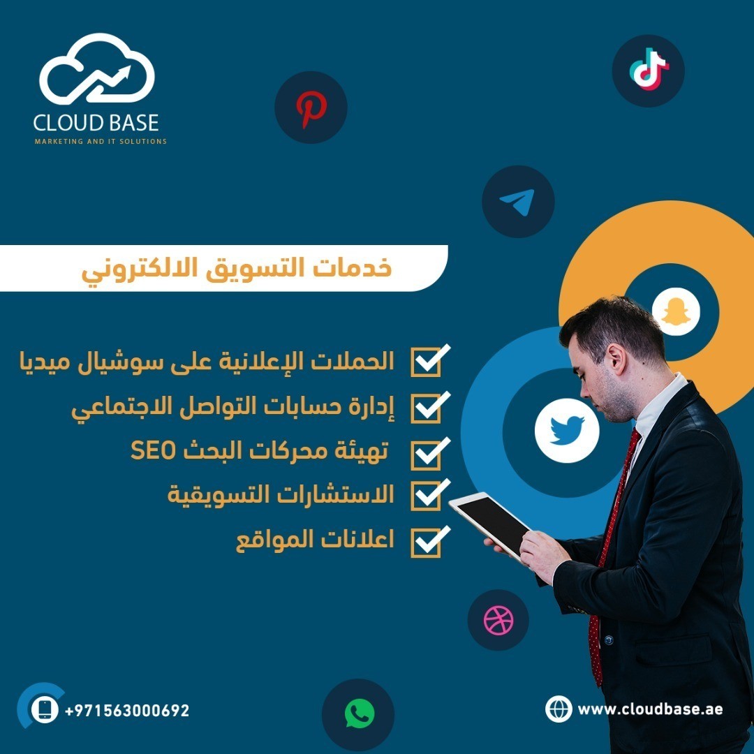 قاعدة سحابة Cloudbase هي شركة رائدة في مجال التسويق والحلول التقنية الذكية لتلبية متطلبات سوق العمل بأحدث الوسائل. من خدماتنا : https://i.suar.me/wYmX4/l تقدم لك خدمات تصميم المواقع الالكترونية بحترافية كبيرة وخبرة عالية الاستضافة والسيرفرات تصاميم الصفحات وحسابات السوشل ميديا في جميع مواقع التواصل الاجتماعي تصميم الحملات الاعلانية الأنظمة والتقنية برمجة تطبيقات الهواتف الذكية الان شركة قاعدة سحابة بين يديك للمزيد زورونا على انستقرام https://www.instagram.com/cloudbase.ae |