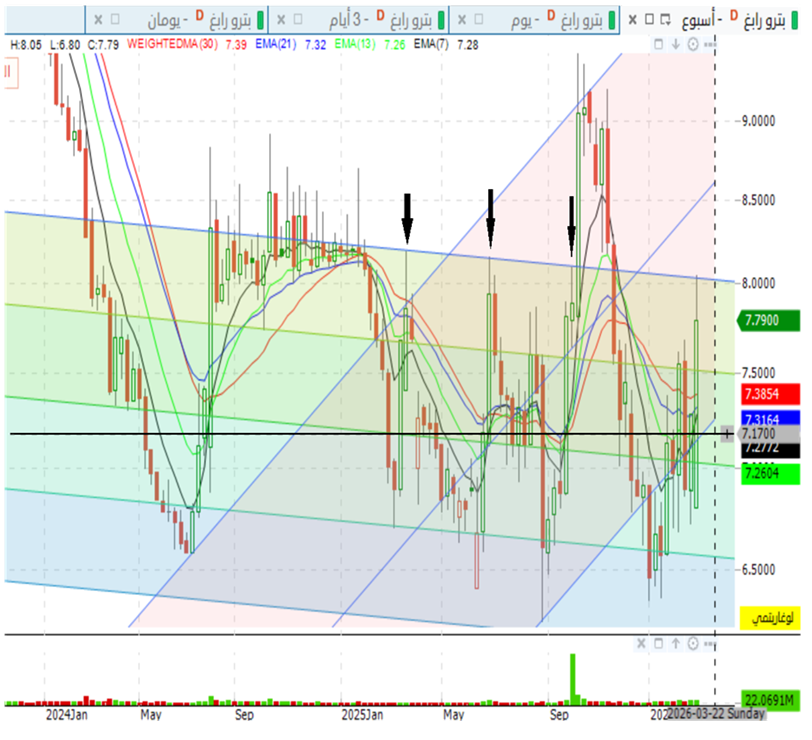 يعني انقضى على هذا التحليل الفني سنتين وكم يوم من غطسنا داخل القنوات الهابطه والصاعده المهم نحترم 7.15 مهما سقط السوق حسب رأي القنوات الصاعده والهابطه والشرط الثاني نخترق اخر قمه حققناها الاسبوع الماضي 8.03 ودمتم سالمين |
