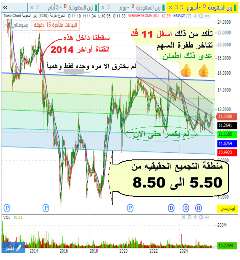 زين يهمني الرقم 11 ونشوف بتأني شكل السهم من يوم غطس للتخلي عن السهم وتصريفه مع تعدد حرق الاسهم لتخفيف الخسائر الماليه ثم منطقة الموت السريري للتجميع الملل والطويل