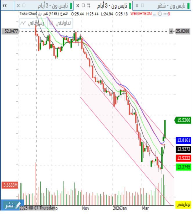 لازال بطن السوق يتحرك بتموج متوازن طبيعي رائع بحيث ان اي سهم يعطي المضارب والصبور ارباح لحظيه واسبوعيه ممتازه ناخذ مثلاً نايس ون اخترق قناة هابطه واختبارها عند 14.10 تقريبا وكل ما يعلي الصعود الى 16 وشوي مثلاً .. الاختبار ينزل كم هلله |