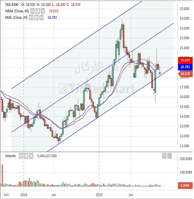 دار الاركان بعد ما كان سلبي جاء خبر سبتمبر وخلف مساره الهابط ورجّعه داخل القناة الصاعده وبدأ تذبذبه رايح جاي لين رجع لقاع القناة