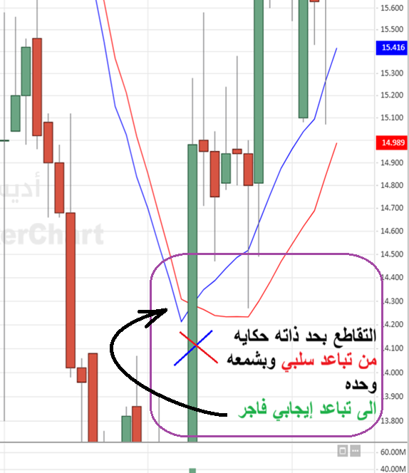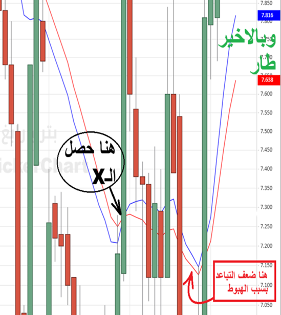 لكن الان بننتقل لوضع اخر استباقي بالمتوسطات بعض الاسهم كان سلبي يعني الاحمر فوق والازرق تحت وطبعا بمرور الاسابيع عكس وصار الاحمر تحت والازرق فوق طيب وين الفكره ؟؟ بشكل تقاطع المتوسطات من سلبي لايجابي .. بعض الشركات التقاطع مسوي X بهذا الشكل هذي يعني ايجابيه مبكره يتبعها تباعد فاحش ملفت للانظار باعطيكم مثالين على تقاطع قوي .. وتقاطع ضعيف مضحك او طويل اهبل ![]()