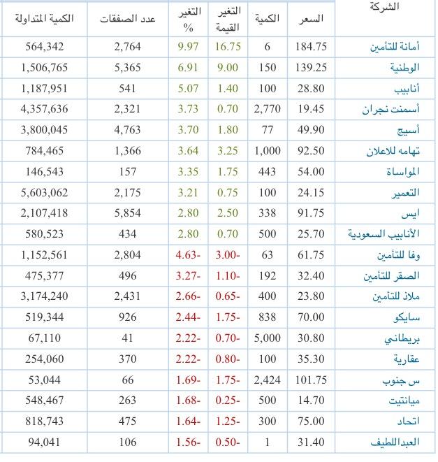 وفا 4.6% الصقر 3.2% ملاذ وسايكو 2.5% ساب والعقارية 2.2% س.الجنوب وأميانتيت وموبايلي والعبداللطيف 1.5% |