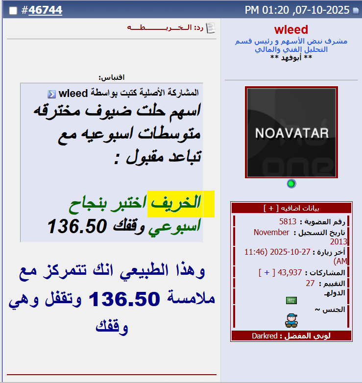 الخريف ضرب 157 وكان يفترض ترفع وقفك معه وترجع بعد تخفيض 10 الى 13 ريال وتشيل ثانيه بدفعات الين نعود حول المتوسطات على افتراض انه بيعمق النزول