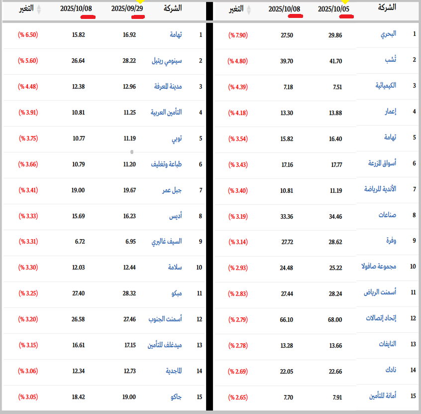 يعني مثلاً قائمه بالاكثر هبوطاً من قمة المؤشر الاخيره وقائمه من نهاية سبتمبر ونقارن ونشوف مين كسر متوسطات اسبوعيه او مين اختبر متوسط شهري .. وهكذا ناخذ فكره لانها بتكون سباقه بالصعود لو كانت اصلاً ايجابيه من عدة اسابيع ..لان اللي مسارها الرئيسي هابط ما لنا شغل فيها نشوفها بعدين نهاية اكتوبر او نوفمبر ![]() |