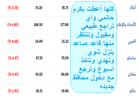 وامس حصل ترويع بالاحمر وبكره احتمال ننتقل من احمر لاخضر بشكل فيه تخويف المهم غداً اغلاق اسبوعي ونرجو ان تعود كل الاسهم الكاسره اختراقها ..نبي بس تقفل فوق المتوسطات بهللات لا تذكر المهم يدخل المنطقة الايجابيه ![]() |
