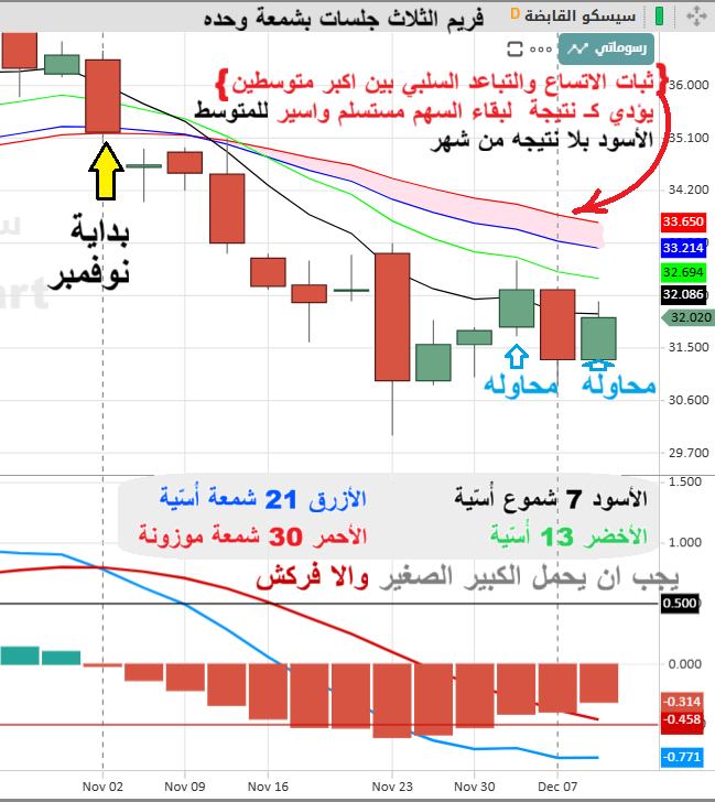 تلقى الشموع اصلاً ماهي قادره تشق اصغر متوسط الاسود وتقبع اسفله طرق خشم باعطيكم مثال سيسكو من بداية نوفمبر خرب طقم الحمام بكسر المتوسطات كسر عامودي للاسفل وعكسها وعكسها في 9 ايام فقط وعقبها شوف كيف تكـلبش وانربط بالمتوسط الصغير تحت صاغر له ولا يستطيع الشرود للاعلى بسبب التباعد الثابت السلبي بين الاحمر والازرق اكبر متوسطين ![]() المصافي /تكوين/مبكو/بي سي اي / |
