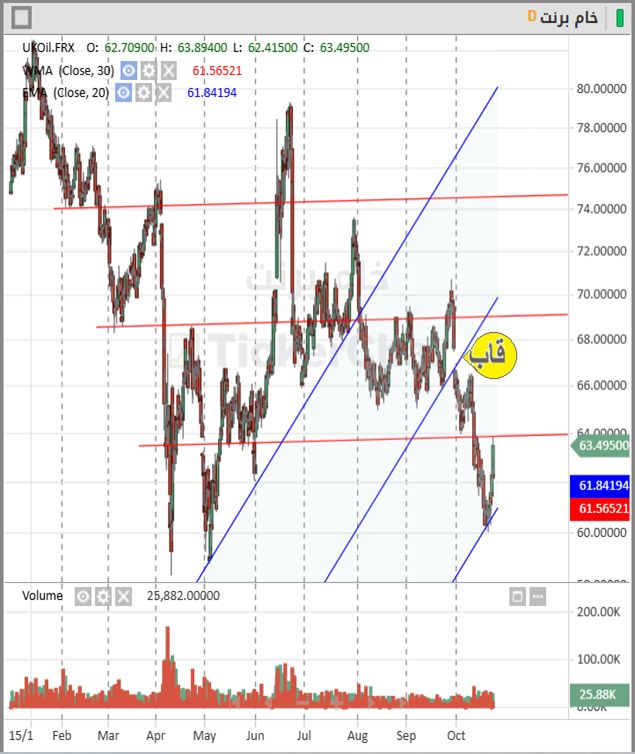 نفط برنت ارتد من قناة صاعدة زرقاء ودقر عند قناة افقيه حمراء